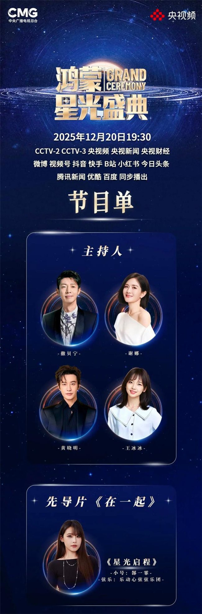 心在一起,我们就在一起!《鸿蒙星光盛典》用特别的方式与您温暖相约,于12月20日19:30在CCTV-2、CCTV-3、央视频、央视新闻、央视财经、微博、视频号、抖音、快手、B站、小红书、腾讯新闻、优酷、百度等200余家平台和账号同步播出。