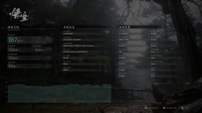 黑神话:悟空在2K分辨率、影视级画质,并开启帧生成的情况下,表现稍微有点夸张。平均帧167fps,最低帧146fps,95%帧率高于152fps,而平稳度差不多就是一条直线。