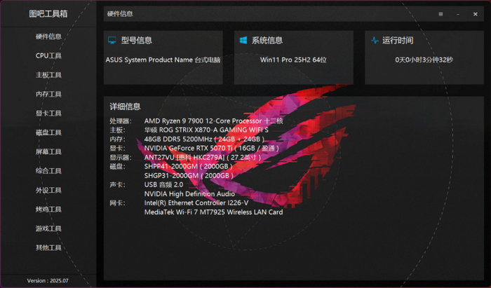 绫龙DDR5整个系列主打的都是6000甜点频率,意向已经非常明确了,就是瞄准的AMD平台。所以,测试主机自然也是以AMD为主,核心配置为Ryzen9 7900+ROG X870吹雪S,显卡则是盈通RTX 5070TI 16GB水着,其余配置就不一一介绍,直接看图。