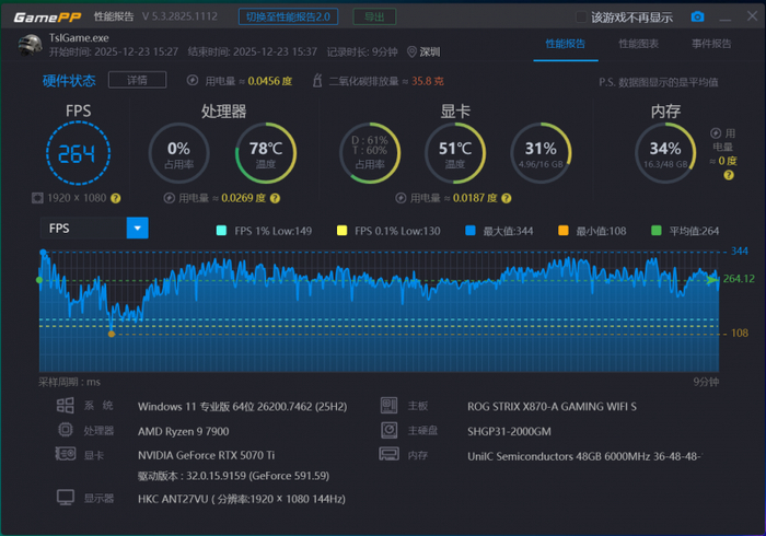 PUBG在1080P分辨率、极高画质下,平均帧264fps,1% Low帧149fps,除了跳伞阶段,落地以后的帧率还是相对比较平稳的,粗略估计最低也在200fps附近。