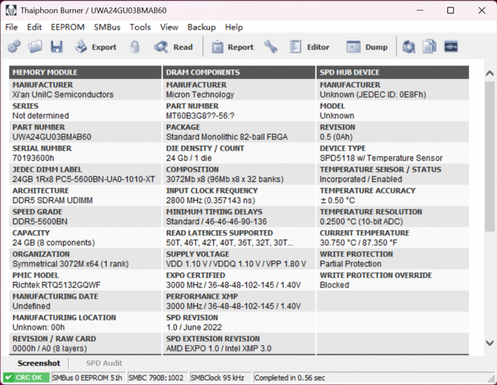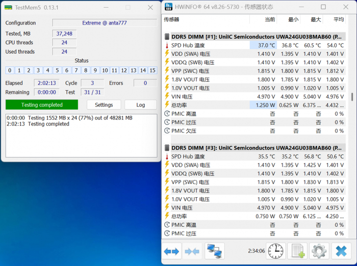 老规矩,上机先用台风软件验明正身。这套绫龙DDR5采用美光颗粒+单面布局设计,单颗粒容量3GB,一条8颗两条也就是48GB,内置EXPO/XMP 3.0两套预设超频参数,可以帮你轻松一键超频到6000 CL36(36-48-48-102 1.4V)