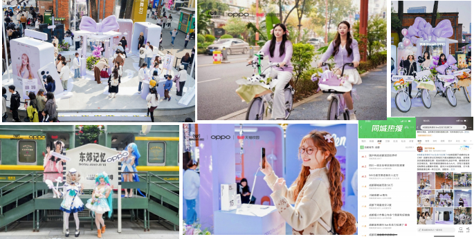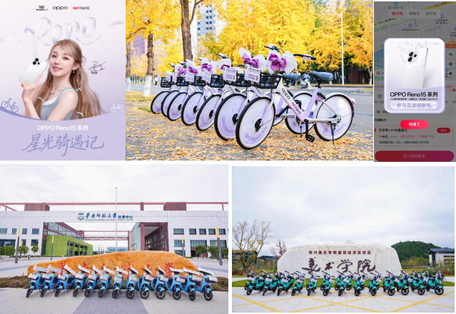 随着OPPO Reno15 系列新品正式发布,活动进入高潮阶段。以“星光骑遇记”为主题的快闪落地成都东郊记忆潮流街区,现场通过巨型星光蝴蝶结装置、雨琦合影海报、Reno15 创意定制痛车等高颜值打卡装置制造焦点。更将体验直接带入高校:联动西南交通大学、电子科技大学等高校的骑行活动,吸引了大量同学们参与。与此同时,线上校园达人引领青春风尚,创作“出圈实况拼图”推动新机热度持续攀升。本次活动成功构建了一个从视觉吸引、场景体验到社交传播的完整闭环,不仅让Reno15 系列的产品形象深入人心,更将新品体验深度融入了年轻群体的校园生活与社交语境之中,有力地推动了从曝光到种草的全过程。