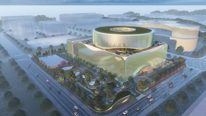 其建筑设计取“天圆地方” 东方哲思,以方正基座承载严苛测试功能,灵动圆环与流线型丝带结构勾勒科技美学,于规整中见韵律,达成功能与形态的高阶统一。
