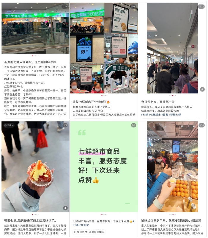 这份火爆也蔓延到了社交媒体。“七鲜新店开业人也太多了”相关话题持续升温,网友们晒出的照片里,货架前人头攒动、试吃区排起长队、购物车堆得满满当当。“谁懂啊!本来只想买瓶水,结果试吃到饱不用吃午饭”“人多到以为是春运现场,结账排了20分钟但值得”“19.9元一斤的榴莲、99元5斤的车厘子,性价比高到闭眼买”,网友们的真实分享,让门店成为自带流量的“打卡地标”。