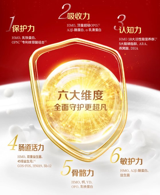 多款产品配备5大脑磷脂群与6重HMO,吸收效率上,采用新一代OPO,SN-2棕榈酸占比达67%,搭配益生菌与益生元(GOS)组成“五重吸收组合”,大幅提升营养转化效率。