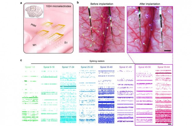为进一步验证该架构的大规模信号采集能力,团队在灵长类大脑中成功植入了1024通道的高密度可拉伸柔性电极——这一规模与Neuralink的核心指标持平,并成功采集到大规模、高质量的神经元信号,再度印证了可拉伸柔性电极的优异性能。