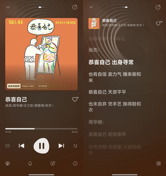这首《恭喜自己》演唱者的年龄横跨五零后到八零后,涵盖了不同人生阶段,再加上周华健的醇厚、王力宏的透亮、谢霆锋的磁性、张杰的抒情,以及成龙大哥那股子江湖气这各具特色的五种声线,听起来更有味道。打开每首歌都有的超高清音频来听,连一些对声音的细节处理,都能让我这个外行人听出来门道,听感真的很绝!