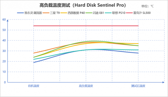 本次温度测试选取84.4GB混合文件包(图片+视频+海量小文件)进行拷贝,同时完成四轮以上跑分测试,全程用Hard Disk Sentinel Pro记录温度变化,从待机温度、高负载最高温、测试后回落温度三个维度,看各产品的控温能力。
