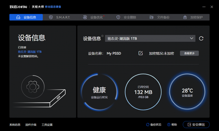 电脑端的天枢大师功能全面,支持设备健康监控、固件升级、设备优化、安全擦除、文件备份,一站式完成硬盘管理。