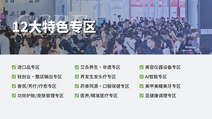 本届展会聚焦“功效、科技、大健康“三大核心板块的同时,为了更高效的在展会现场达成贸易配对,组委会深挖终端市场需求及当下美业消费趋势,特色12大特色专区,以专区形式集中展示美业细分领域的新产品、新项目及新技术,让展品和买家“精准匹配“。您不用在大杂烩式的展区里“埋没”,而是和同赛道的优质企业、精准买家 “同场亮相”,谈合作的效率直接翻倍。