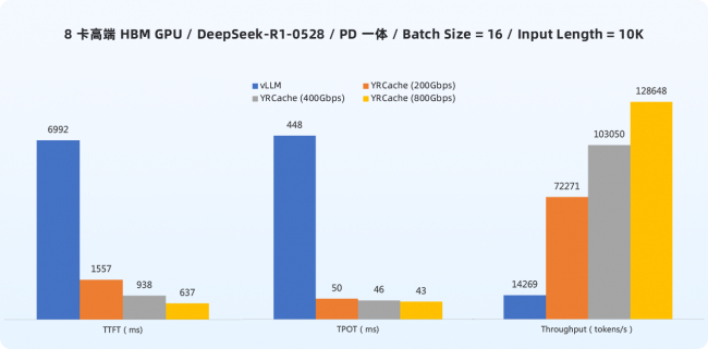 本次测试在基于 NVIDIA 计算和网络平台的真实推理环境中进行,采用DeepSeek-R1等主流大模型,覆盖了中端 GDDR GPU 与高端 HBM GPU 两类算力节点,对比了在不同网络带宽配置(200Gbps / 400Gbps / 800Gbps)下,原生 vLLM 框架与集成 YRCache 后的系统性能。本次测试核心成果亮点显著: