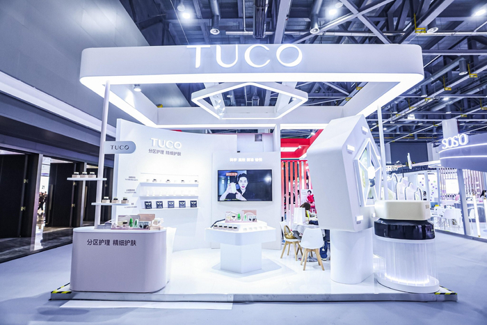 据了解,TUCO品牌诞生于广州,品牌名称与商标设计理念来源于人脸部的四大护肤分区——T区(前额和鼻部)、U区(两颊)、C区(眼部)和O区(唇部),品牌定位“肌理专家”,致力于帮助每一位有肌肤困扰的用户精准改善、精细呵护。本次展会,TUCO将品牌主张融入展厅设计,让抽象护肤理念转化为可感知、可体验的沉浸式场景。