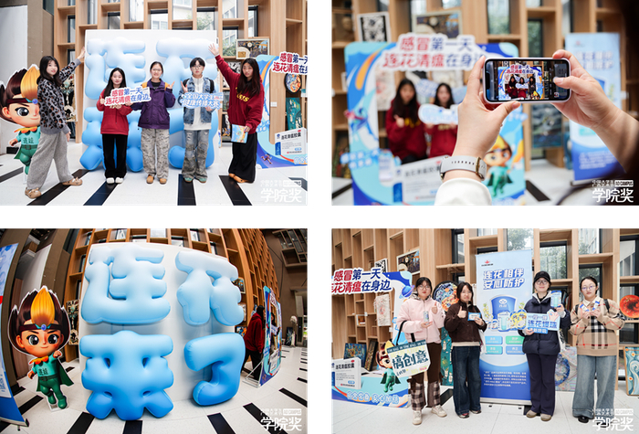 活动场外的品牌体验区也是人潮涌动,互动区域前嘉宾学子排起了长队,大家纷纷在连花清瘟主题背景板前驻足合影,手持“感冒第一天,连花清瘟在身边”主题手举牌摆出各种创意姿势,用镜头定格下与品牌互动的青春瞬间。欢声笑语此起彼伏,现场气氛热烈而活跃,让品牌理念在轻松有趣的打卡体验中焕新出彩。