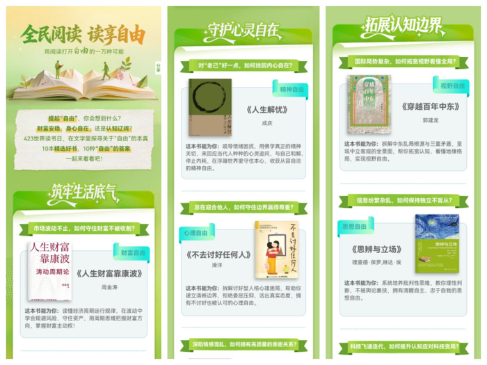 世界读书日,华为阅读也推出了“阅读使人自由”专属书单,用阅读帮助用户打开更多“自由之门”,从《人生财富靠康波》《懒人养龙虾:扣子+OpenClaw》《职场人该这样保护心脏了》带读者提升认知,走向财富自由、技术自由、身体自由,筑牢生活底气;以《人生解忧》《不去讨好任何人》《高质量亲密关系》与读者一起学习精神自由、心理自由、感情自由,守护心灵自在;通过《穿越百年中东》《思辨与立场》《科技共和国》打开视野自由、思想自由、认知自由,拓展认知边界;深层认识《阅读是一座随身携带的避难所》,从而启发读者思考,从多个层面帮助用户成长,走向更广阔的世界。