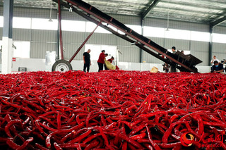 勉县引入辣椒种植,促进贫困群众依靠短线产业尽快增收脱贫。通过“公司+合作社+种植户”的模式,与各贫困村股份经济合作社签订辣椒种植及保底收购协议。近年全县发展辣椒3万亩,其中5000余贫困户参与种植,带动增收超过8000万元。图为正值收获时节的鲜辣椒。人民网 鄂智超 摄