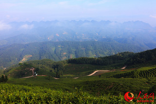 漆树坝镇坐落于勉县南部,全镇茶园总面积达6.2万亩,茶产业成为这里群众增收的重要来源之一。国铁集团与当地茶园签署劳保用茶协议,以销定产,稳定收购,带动群众脱贫。图为漆树坝镇海拔1200米的茶园景观。人民网 鄂智超 摄