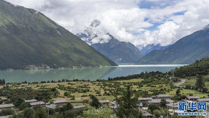 这是风光秀美的巴松错,近处房屋为结巴村民居(9月15日摄)。新华社记者 王沁鸥 摄