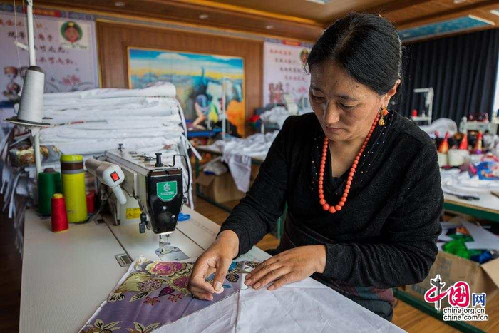 在合作社顶楼,是“亚一则则”吉祥娃娃的制作车间。这里就业的多是留守妇女、贫困户。白河社区的居家妇女们深受藏族民间刺绣文化的熏陶,再加上专业的现代培训,灵活的就业形式使她们不仅可以增加家庭收入,还可以将藏族民间刺绣文化传承下去。新冠肺炎疫情爆发期间,合作社利用手工优势,在专业指导下制作民用防疫口罩,1个半月制作了近6万个口罩,全部用于基层防疫使用。中国网记者 郑亮摄
