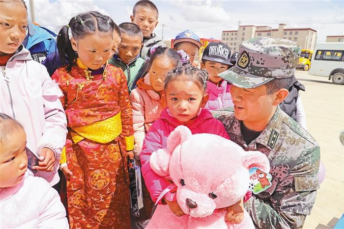 近日,西藏那曲军分区官兵带着礼物和文具来到孤儿院,看望这里的孩子们,给他们讲故事,陪他们做游戏。