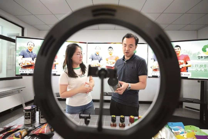 陕西省咸阳市淳化县石桥镇大槐树村第一书记王剑峰(右)在直播室向本刊记者介绍大槐树村农特产品。刘红涛摄01