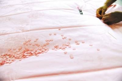 抽丝是个细致活儿。抽丝过程中,要不断捞出废弃物,结束时再将抽丝筒上的蚕丝割裂、拽出,然后洗净、甩干、蒸煮,挂入烤房烘干。制作蚕丝被时,崔军品和焦素梅相互配合,经过拉丝、称重、铺丝、收边、缝边、装被套、钉花固定等工序,一床蚕丝被才算完工。“铺丝时要横竖相间,四角和横竖钉花要用29个点、两面58朵花把蚕丝固定在被套上,实用又好看。”崔军品说,因为他们的蚕丝被货真价实,来这里买的人可以现场监督制作过程,不能来的人也可以看到制作视频,所以不愁销路。