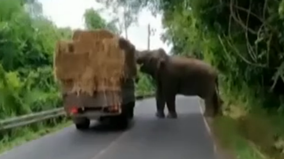 近日,在泰国的考艾国家公园,一头大象在马路边“拦截”了一辆装着干草的货车,并偷走了其中一捆干草。