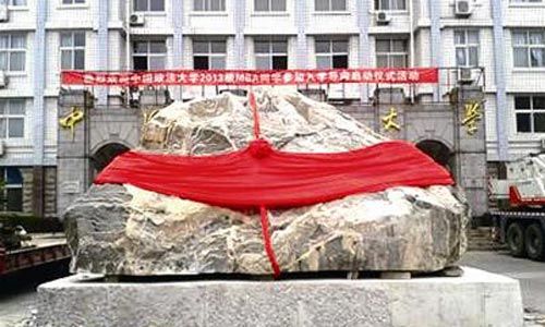 今年6月,中国政法大学一位副院长亲自到泰山脚下的黄前镇买走了一块巨石。之后,这位副院长在微博中贴出这块泰山石的照片,写道:“法大泰山,安放教学楼前”。有同事问这位副院长:“是你搞来的?”副院长回答:“按专业术语应该是‘请来’,泰山原石,不刻字!”他说其中的寓意说:“唯有法大、法泰,国始安!”据知情者透露,这块石头重几十吨,价格约为14万元,用大拖车从泰安运到北京,运费1万元。(中国新闻周刊8月27日)