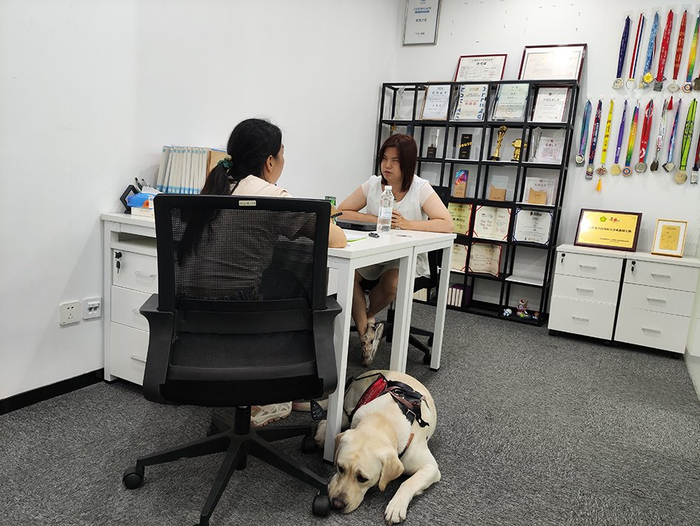 人群中很容易找到马寅青,她的身边总带着一只白色的拉布拉多犬,它叫盖娅,是导盲犬。