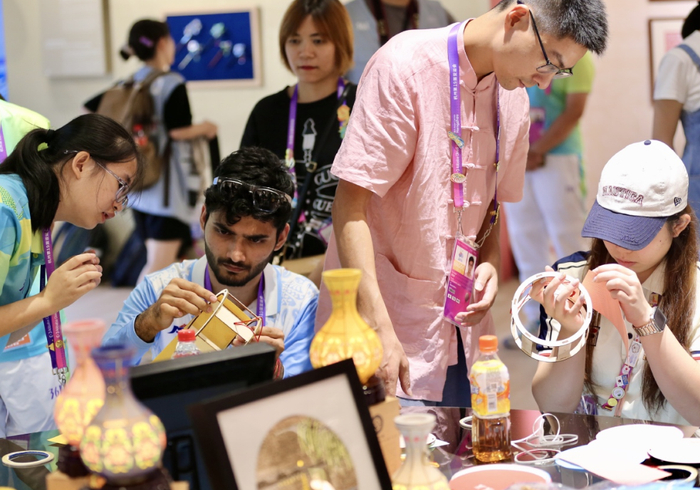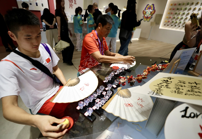 在亚运村的文化屋,陈列了中式传统服装、杭州剪纸、西湖绸伞等精美的手工艺品。赛事期间,亚运村的文化屋将化身为中国文化展示馆,非物质文化遗产的展示是其中的重要内容,涉及42个非遗项目,自开村以来,已经举办了142场非遗活动。