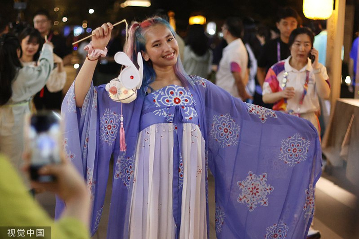 除此之外,不少运动员也加入了汉服体验的行列,来自五湖四海的运动员身着汉服徜徉亚运村,也造就了一道独特的风景线。