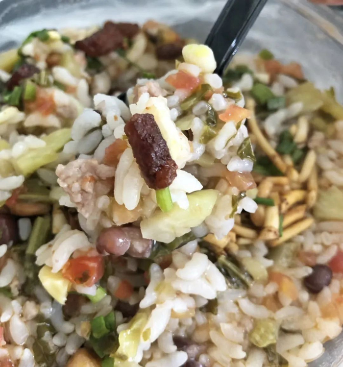 以酸菜豆米为制作原料,放入番茄一起烹煮,加热时加入米饭,令其充分吸饱浓稠的汤汁,最后放入葱花、脆哨、折耳根,炸花生提香。