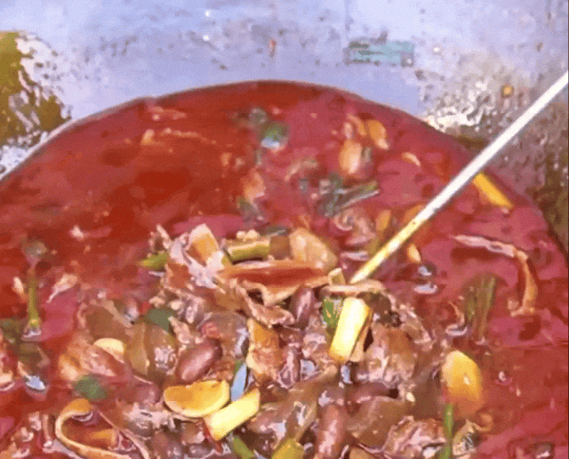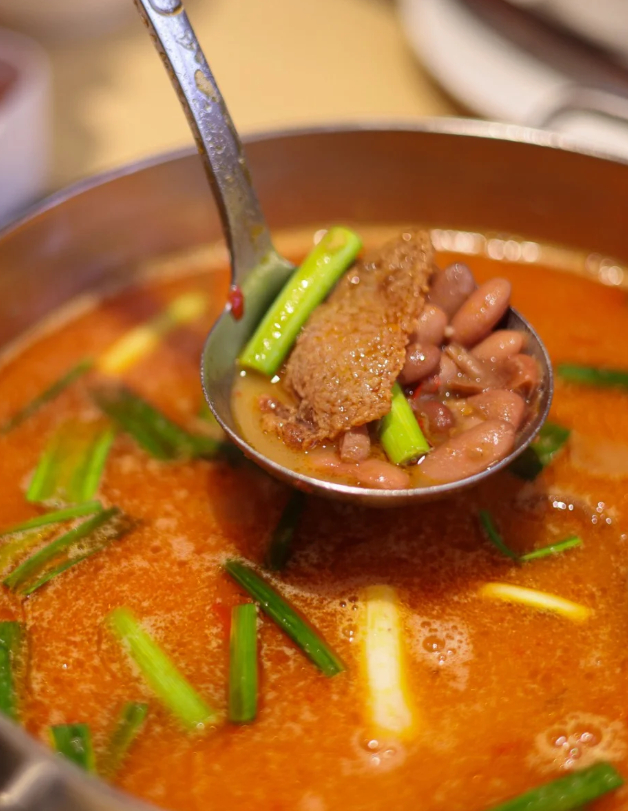 红油、辣椒加上牛骨高汤和豆米
