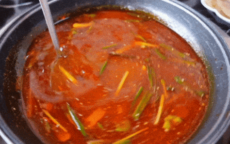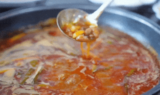 再把鲜嫩的牛肉倒入浓汤里涮一涮
