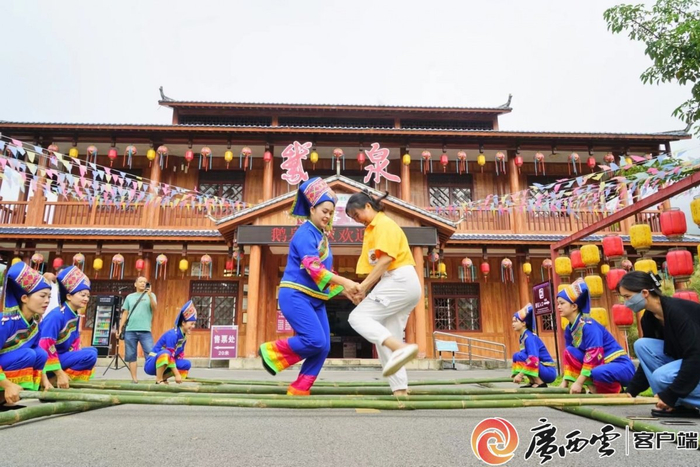 中秋、国庆假期期间,靖西市举办中秋国庆文化旅游节,各景区推出非遗民俗文化展演、汉服灯谜会、花灯DIY等一系列活动,推动旅游市场持续火爆。据统计,9月29日至10月2日,该市日游客接待量均在10万人次左右。图为游客在鹅泉景区跳竹竿舞。广西日报-广西云客户端记者 韦鹏雁 通讯员 何艳玲 摄