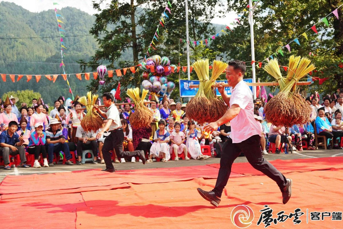 10月4日,融水苗族自治县红水乡良双村旧寨屯举行第三届“保护古村落 和美丰收节”农耕趣味比赛,村民在剪禾、挑禾把接力等趣味比赛中庆祝丰收,欢度国庆。龙涛 摄