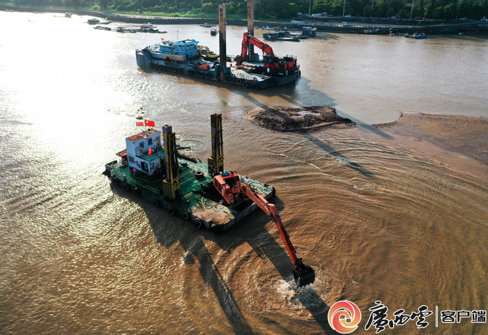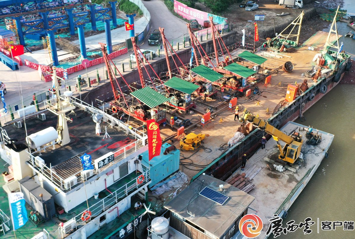 10月4日,在钦州钦江沙井大桥下游,各种施工机械正在江边和江面上进行平陆运河河道和钢栈桥的施工,远处的天鲸号也在钦江出海口进行疏浚作业,整个江面一派忙碌的景象。