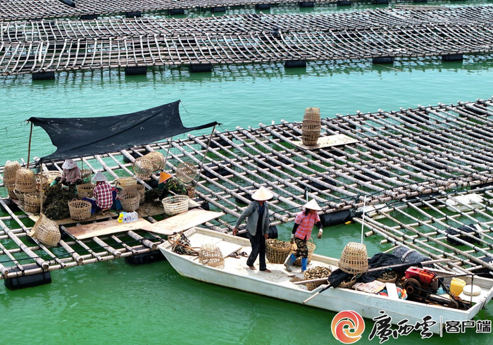 10月4日,随着国庆假期游人对海产品需求的不断增长,在钦州茅尾海的万亩蚝排上,养殖户们正在忙着收大蚝,分拣装船运往市场销售。
