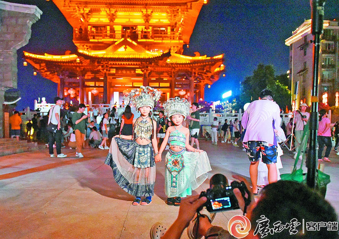 中秋国庆假期期间,到桂林市东西巷打卡,穿上美丽的民族服饰在古建筑前留影,成为外地游客争相选择的旅游项目之一。图为10月2日,游客在东西巷历史文化街区逍遥楼前拍照留念。黄捷文 摄