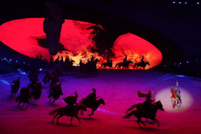 坐在蒙古马演艺厅观众席上,每当节目大幕徐徐拉开,浓烈的文化气息扑面而来。序曲“天赐白马”,“萨满唱诵赞歌召唤,古老的人马情缘化作一滴澎湃之血,注入白马之躯……”,铁骑出征、回望初恋、一往无前、自由天驹等12个章节,150名舞蹈演员、120名马术演员和160匹马匹同时表演,一段人马情深的动人故事就此演绎。震撼的“实景”构建,历史与文化生动而统一的讲述,创造出视听层面和精神层面“奇观”,更像一封意蕴绵长的请柬,邀请全国各地的游客朋友前来观看。