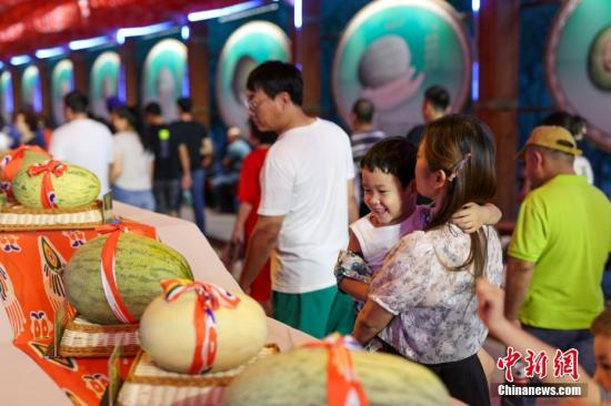 7月19日晚,新疆哈密,名为“夜游贡瓜园”的游园活动拉开帷幕。“夜游贡瓜园”是第十七届哈密瓜节主打活动之一,游客不仅可以观看非遗展演、逛品瓜长廊,还能了解学习哈密瓜相关知识,感受哈密深厚的文化底蕴和淳朴的民俗风情。图为小朋友观看哈密瓜展示。中新社记者 贾天勇 摄