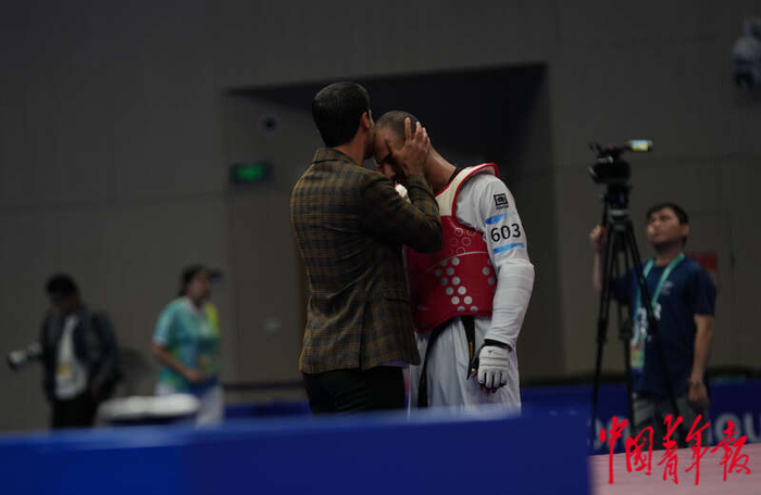 10月24日晚,浙江杭州,萧山瓜沥文化体育中心,杭州亚残运会跆拳道男子K44级70kg决赛后,伊朗队教练亲吻夺冠的伊朗选手迈赫迪·普拉纳玛阿马古拉比。中青报·中青网记者李峥苨/摄