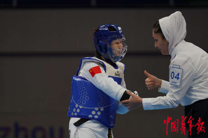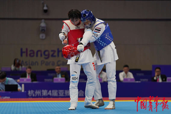 10月24日晚,浙江杭州,萧山瓜沥文化体育中心,杭州亚残运会跆拳道女子K44级57KG铜牌赛中,裁判员帮助中国选手杨丽婷检查手部护具。中青报·中青网记者李峥苨/摄