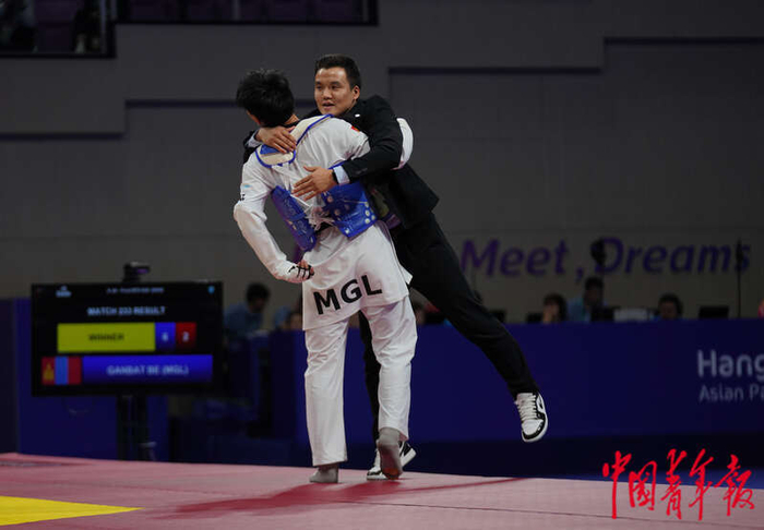 10月24日晚,浙江杭州,萧山瓜沥文化体育中心,杭州亚残运会跆拳道男子K44级63KG决赛后,夺冠的蒙古选手博洛尔-额尔德尼·甘巴特一把抱起教练,表达喜悦之情。中青报·中青网记者 李峥苨/摄