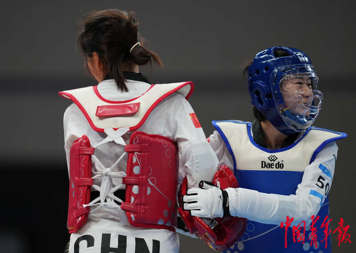 10月24日晚,浙江杭州,萧山瓜沥文化体育中心,在杭州亚残运会跆拳道女子K44级57KG铜牌赛中对战的两位中国选手杨丽婷(右)和李羽洁(左),赛后互相轻拍问候。中青报·中青网记者李峥苨/摄