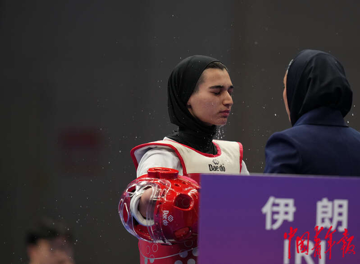 10月24日晚,浙江杭州,萧山瓜沥文化体育中心,杭州亚残运会跆拳道女子K44级57KG决赛前,教练在伊朗选手萝扎·易卜拉希米脸上泼水。萝扎·易卜拉希米在本场比赛中夺冠。中青报·中青网记者李峥苨/摄
