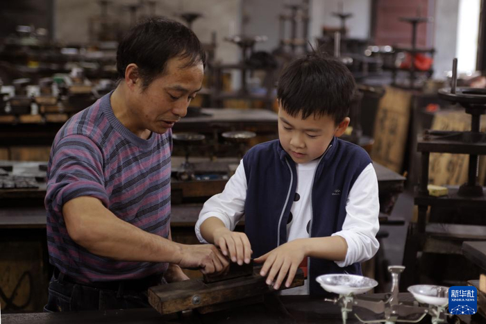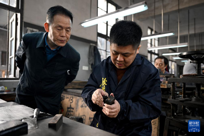 10月24日,周健的儿子周墨(右)在工人的指导下制作徽墨。