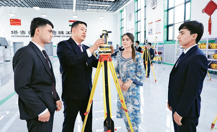 “鲁班工坊”,主要目标是为合作国家培养高素质技术技能人才,被称为“一带一路”上的“技术驿站”。图为2023年4月12日,在塔吉克斯坦首都杜尚别的“鲁班工坊”内,一位来自天津城市建设管理职业技术学院的老师向学生讲解测绘仪器使用方法。 新华社发 奥斯帕诺夫/摄