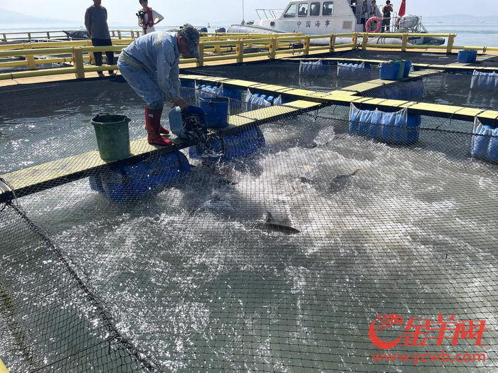 万佳水产作为全市首个推进网箱“去木换塑”的水产企业,已完成新型环保材料海水养殖网箱升级试点改造,打造了40格新型塑胶网箱,改造后生产效益为原本的3倍。该企业试点开展花鲈鱼苗育种,打造省级花鲈育苗基地,目前总投资8000万元的省级花鲈良种场已引进1000多条花鲈亲鱼进行海水适应性培育,全面建成后3年内可年培育优质花鲈苗达3亿尾、年产值超3亿。