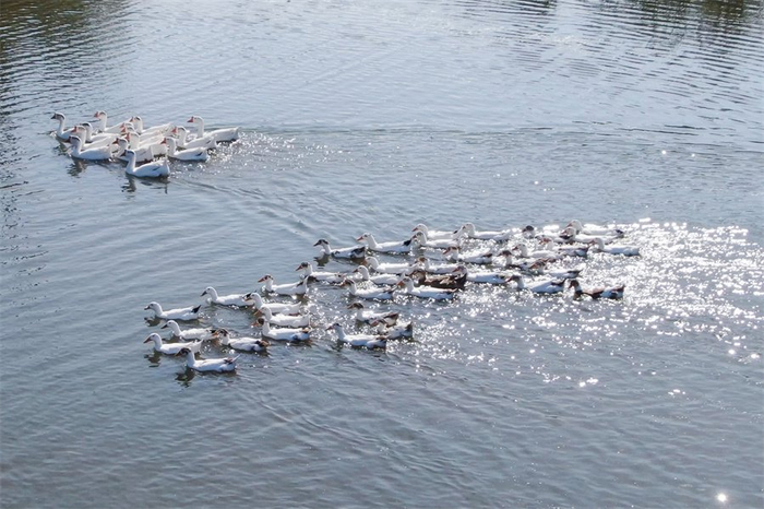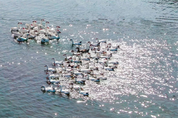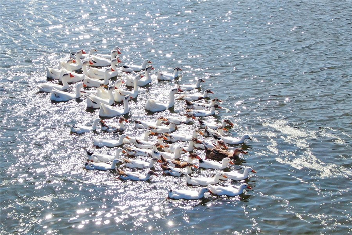 深秋时节,在河南省南阳市镇平县赵河湿地公园里,一群鹅鸭正在游弋戏水,宛若一幅花样游泳图。