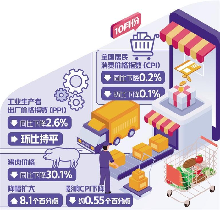 国家统计局11月9日发布数据显示,10月份,全国居民消费价格指数(CPI)同比下降0.2%,环比下降0.1%;工业生产者出厂价格指数(PPI)同比下降2.6%,环比持平。